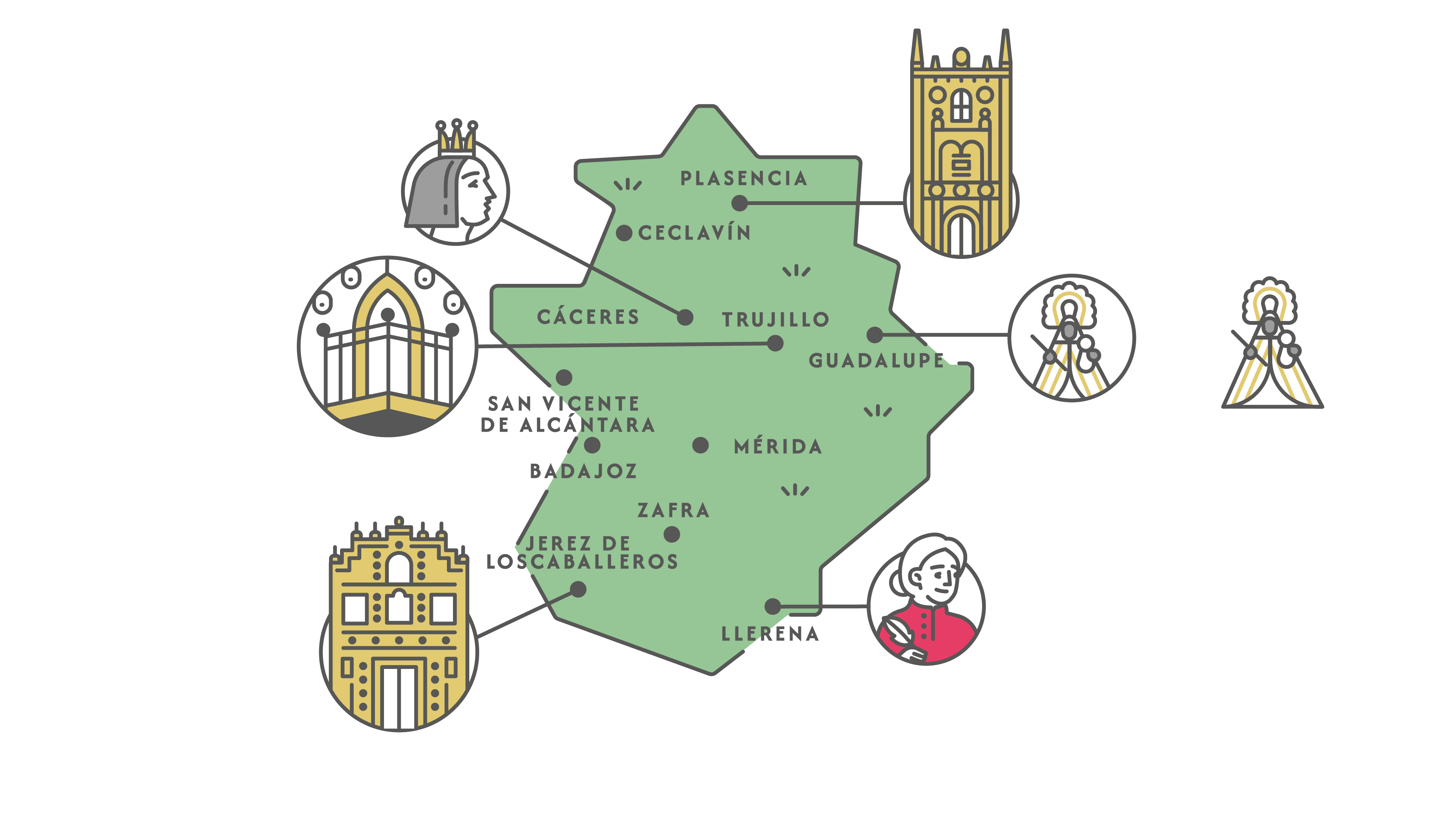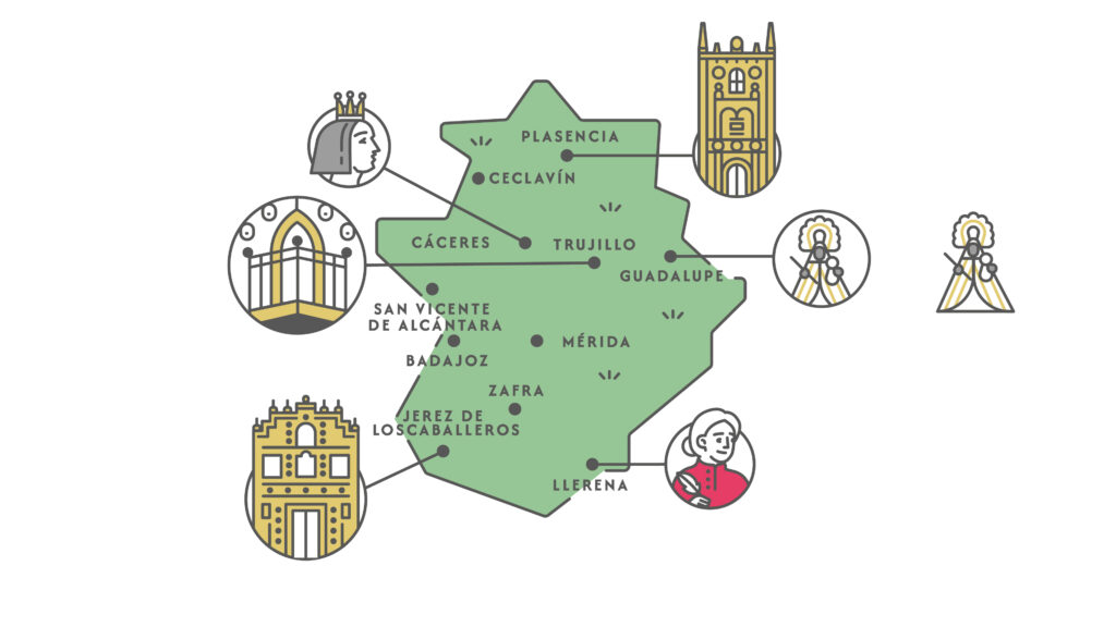 Trujillo, Cáceres, Plasencia, Guadalupe, Zafra, San Vicente de Alcántara, Torrejoncillo, Ceclavín Jerez de los Caballeros, Llerena son poblaciones que integran este viaje en la parte extremeña.